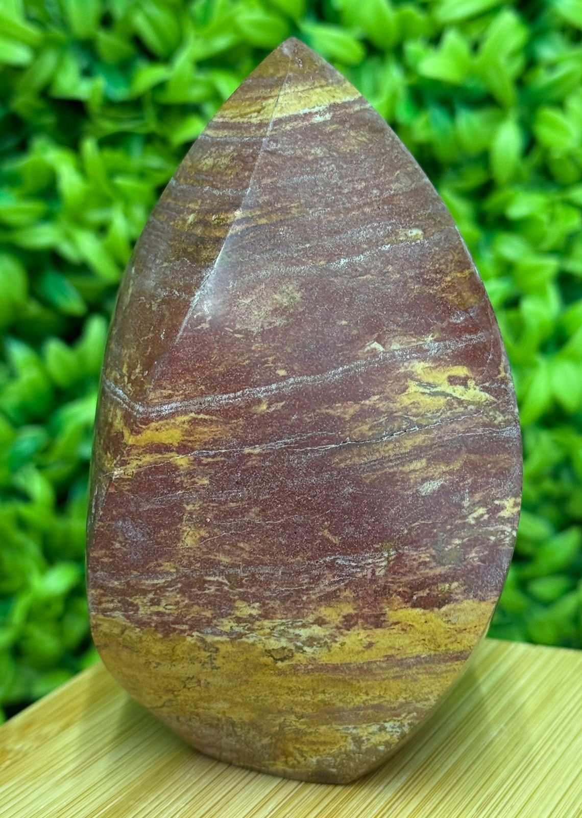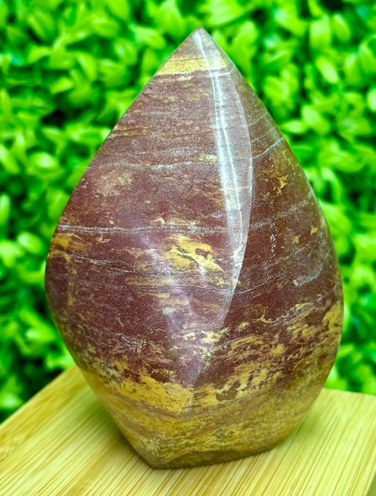 Esta imponente chama de jaspe vermelho é uma peça esculpida em pedra natural, com tonalidade vibrante e acabamento polido que destaca os veios e a intensidade do vermelho característico do jaspe. Uma peça marcante para quem valoriza beleza e autenticidade.