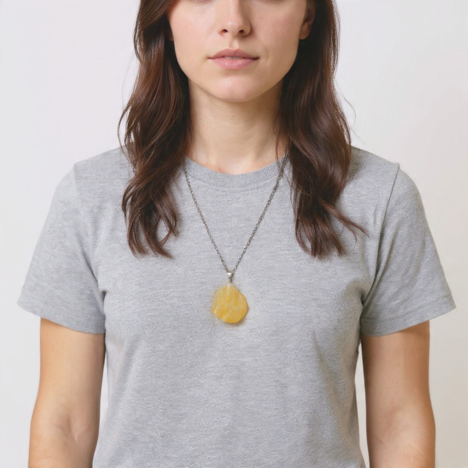 O pingente em Calcita Mel natural em estado bruto, com tamanho aproximado entre 2 e 3 cm, preserva a forma original da pedra, valorizando sua beleza orgânica e singularidade. A corrente em aço inox, resistente e antialérgica, possui regulagem de 40 a 45 cm, oferecendo conforto, durabilidade e excelente ajuste ao pescoço.