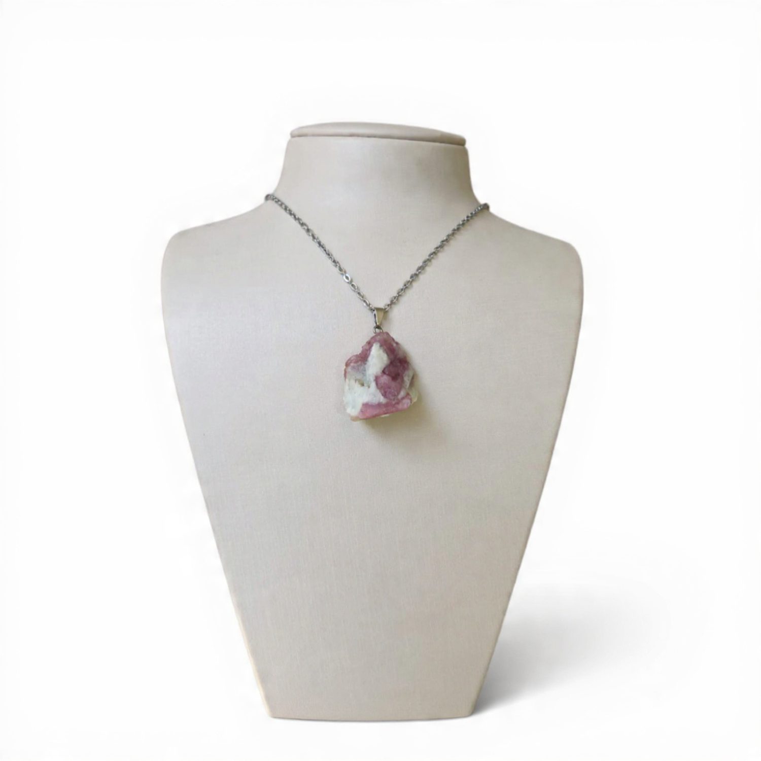 O pingente apresenta Turmalina Rosa naturalmente formada sobre Albita, criando um contraste elegante e orgânico. Seu tamanho entre 2 e 3 cm torna a peça equilibrada e versátil, perfeita para uso diário ou ocasiões especiais. A corrente em aço inox antialérgico, com medida ajustável de 40 a 45 cm, garante conforto, resistência e excelente adaptação ao pescoço.