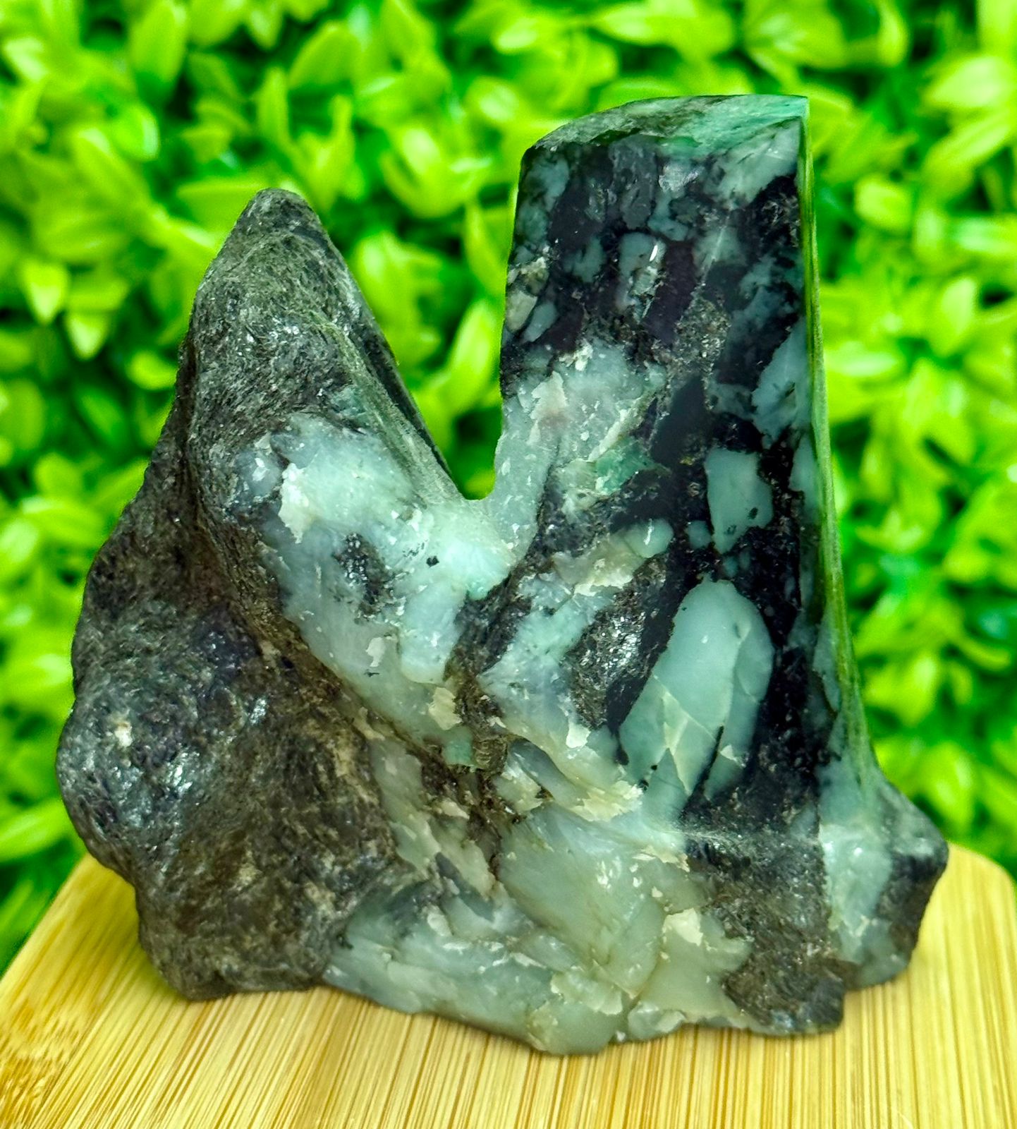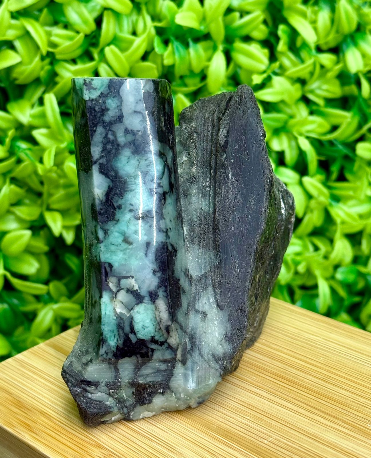 Uma peça única e de destaque, esta Esmeralda Polida na Matriz combina o brilho intenso da pedra com a rusticidade natural da rocha original. Ideal para quem busca uma peça autêntica para coleção, decoração ou uso energético.