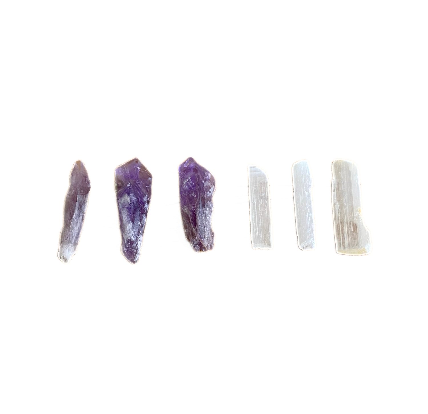 Cada kit contém 6 peças naturais, sendo 3 pontas de Ametista e 3 bastões de Selenita Branca, com tamanhos aproximados ideais para uso prático no dia a dia. As peças são 100% naturais e preservam suas características originais, apresentando variações de forma, transparência e tonalidade — tornando cada kit único e exclusivo 🌍