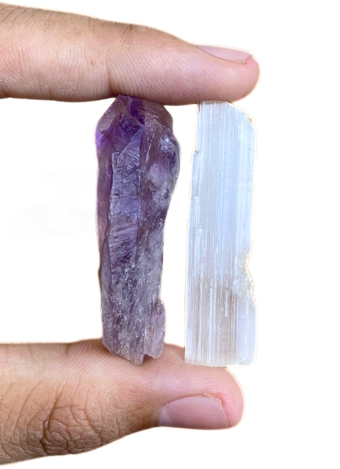 A Selenita é tradicionalmente conhecida por não acumular energia, enquanto a Ametista pode ser energizada conforme preferência.