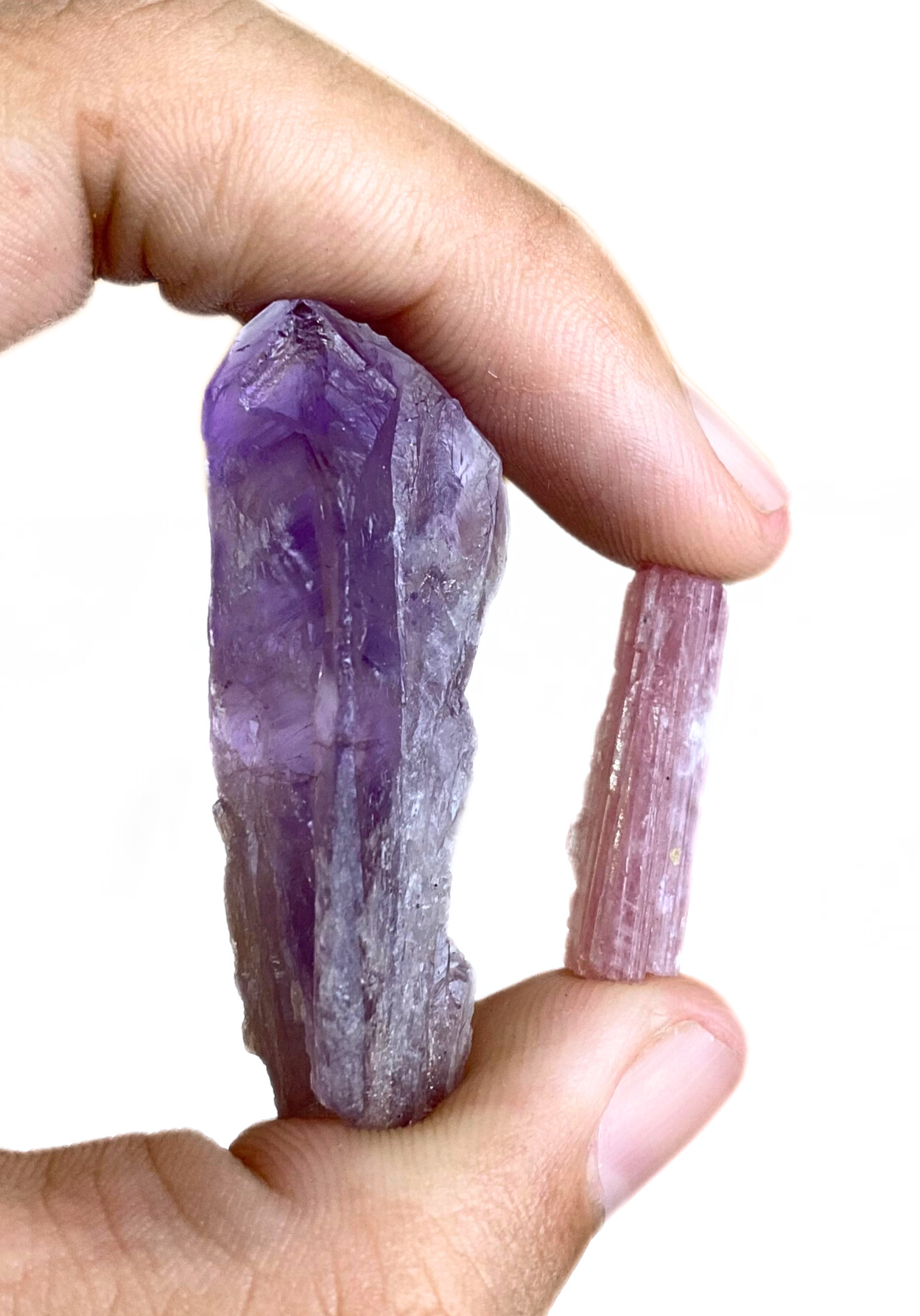 A Ametista, em formato de ponta natural, é amplamente conhecida por sua associação à proteção espiritual, equilíbrio emocional e transmutação de energias. Já a Turmalina Rosa, com sua coloração delicada, é tradicionalmente ligada ao amor, cura emocional e abertura do coração. Juntas, essas pedras formam um conjunto complementar que auxilia na proteção do campo energético, fortalecimento emocional e harmonização dos sentimentos ✨