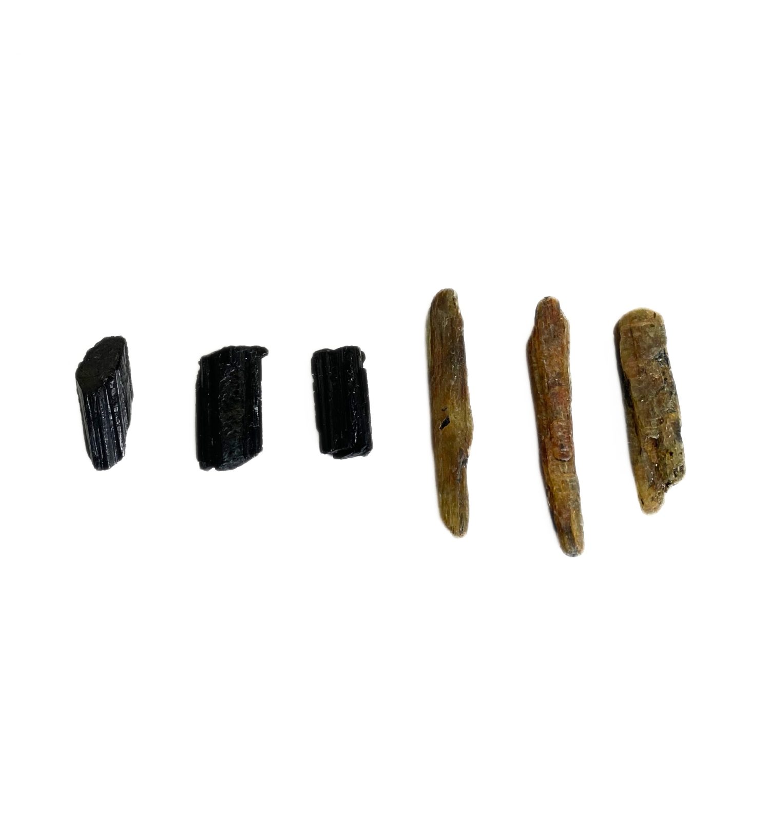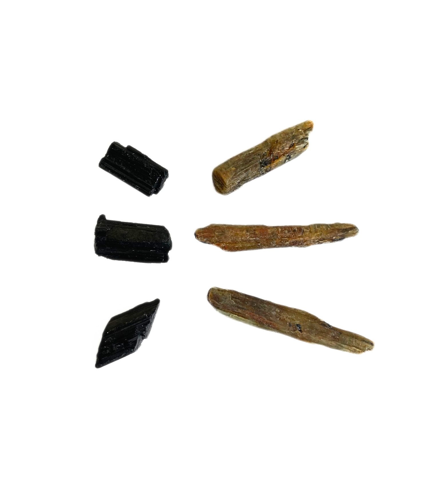 Cada kit contém 6 peças naturais, sendo 3 bastões de Turmalina Negra e 3 bastões de Cianita Laranja, com tamanhos aproximados ideais para uso prático no dia a dia. As peças são 100% naturais e preservam suas características originais, apresentando variações de forma, textura e tonalidade — tornando cada kit único e exclusivo 🌍