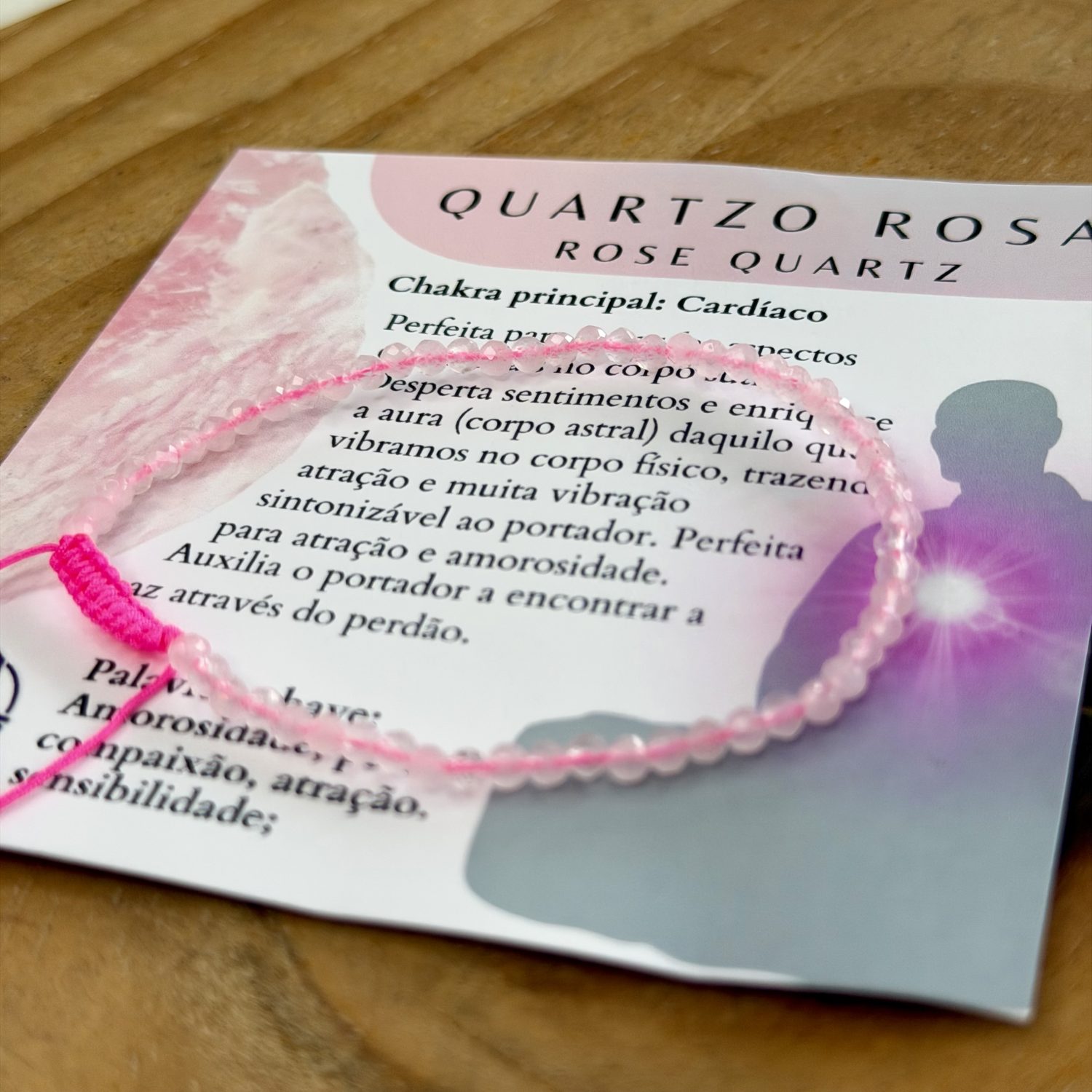 Pulseira de Quartzo Rosa em Macramê Fino Ajustável
